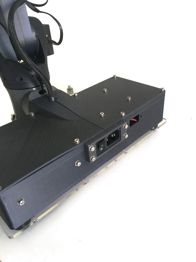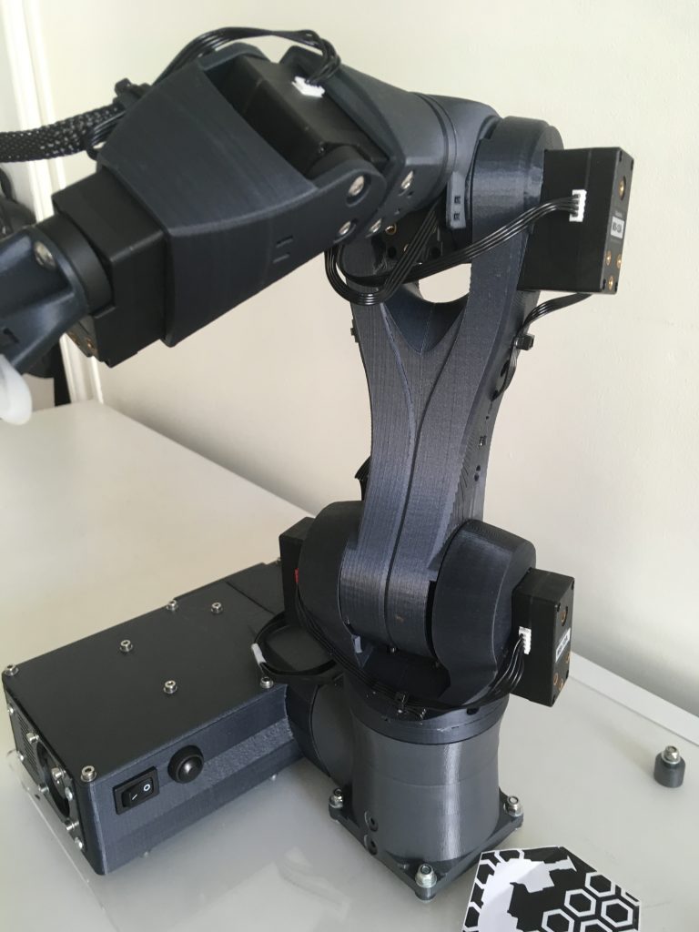 Als Herzstück der Hardware kann man in diesem Zusammenhang die verwendeten Smart Servos MS12-A der Firma Makeblock betrachten. Diese werden von einem Mikrocontroller über UART angesprochen und können Feedback zu Temperatur, Strom, Spannung, Winkel und Geschwindigkeit geben.