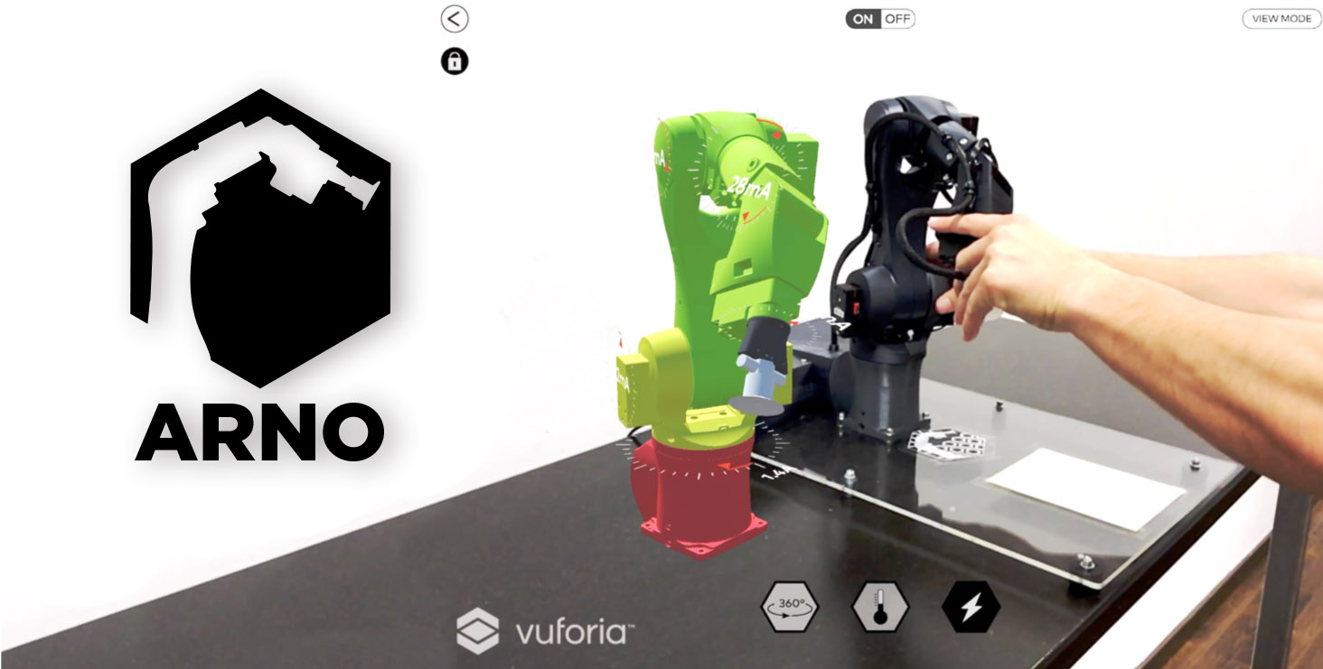 Als Showcase für die Anwendung von Augmented Reality in der Robotik entstand im Rahmen der Bachelorarbeiten von meinem Kollegen Tobias Glaser und mir ARNO (Augmented Reality Robot One). ARNO ist ein kleiner Desktoproboter, dessen Design und Kinematik an den KUKA Agilus KR10 angelehnt ist. Ziel der Arbeiten war die Entwicklung eines Roboters im Desktopformat, der alle aktuellen Prozessdaten an eine Augmented Reality-Applikation sendet und dort Visualisierungen, Simulationen und die Steuerung des Roboters über mobile Geräte ermöglicht.