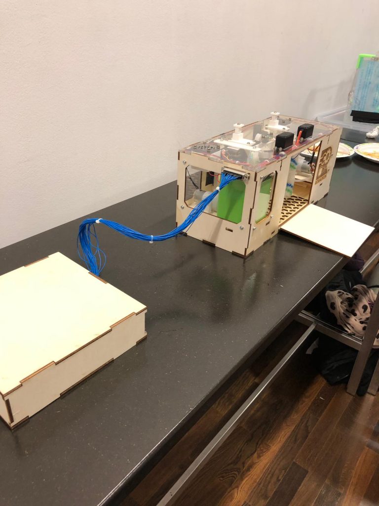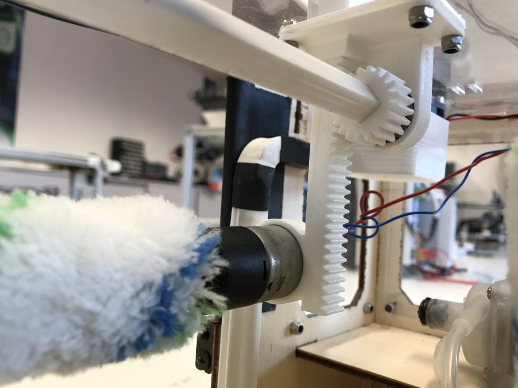 Passend zu dem nachhaltigen Gedanken der Waschbox wurde der Prototyp zu einem Großteil aus Holz gefertigt. Dafür wurde ein CAD-Modell der gesamten Anlage gezeichnet und die Teile mit dem 3D-Drucker und dem Laser-Cutter gefertigt. Mit einem Raspberry und einem Arduino wurde die Steuerung und die Verbindung zu der IoT-App umgesetzt.