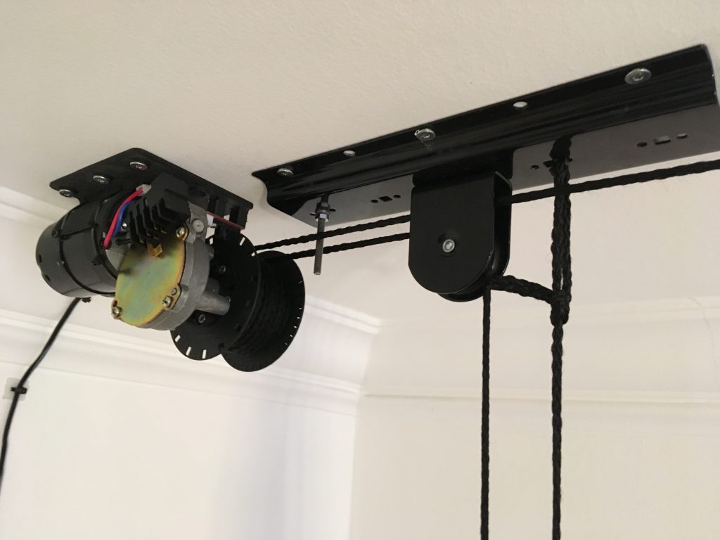 Die Grundanforderungen an das System waren schnell klar: ein Motor mit selbsthemmendem Getriebe, der stark genug ist über Umlenkrollen einen vollen Wäscheständer mit nasser Wäsche Richtung Decke zu bewegen.